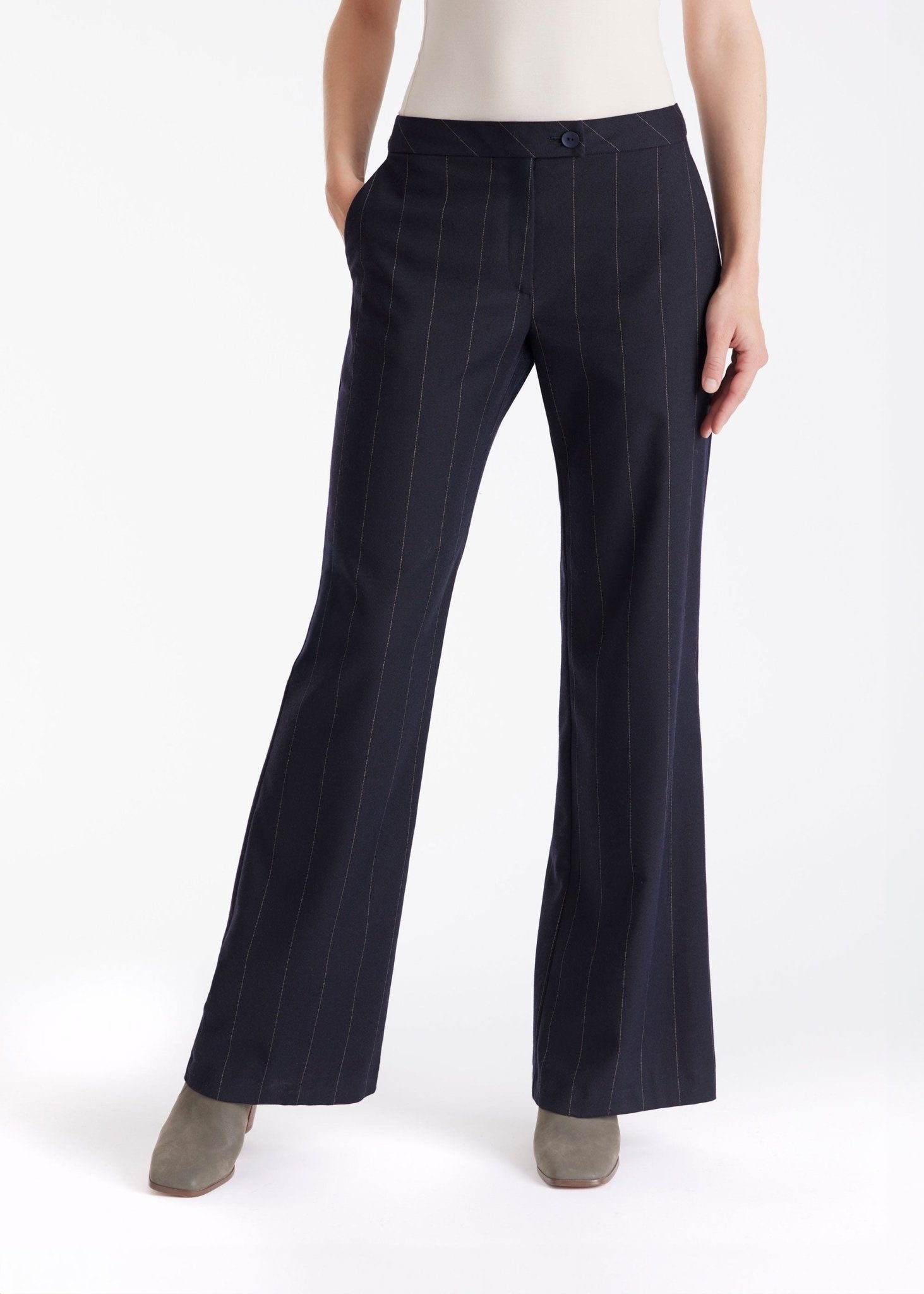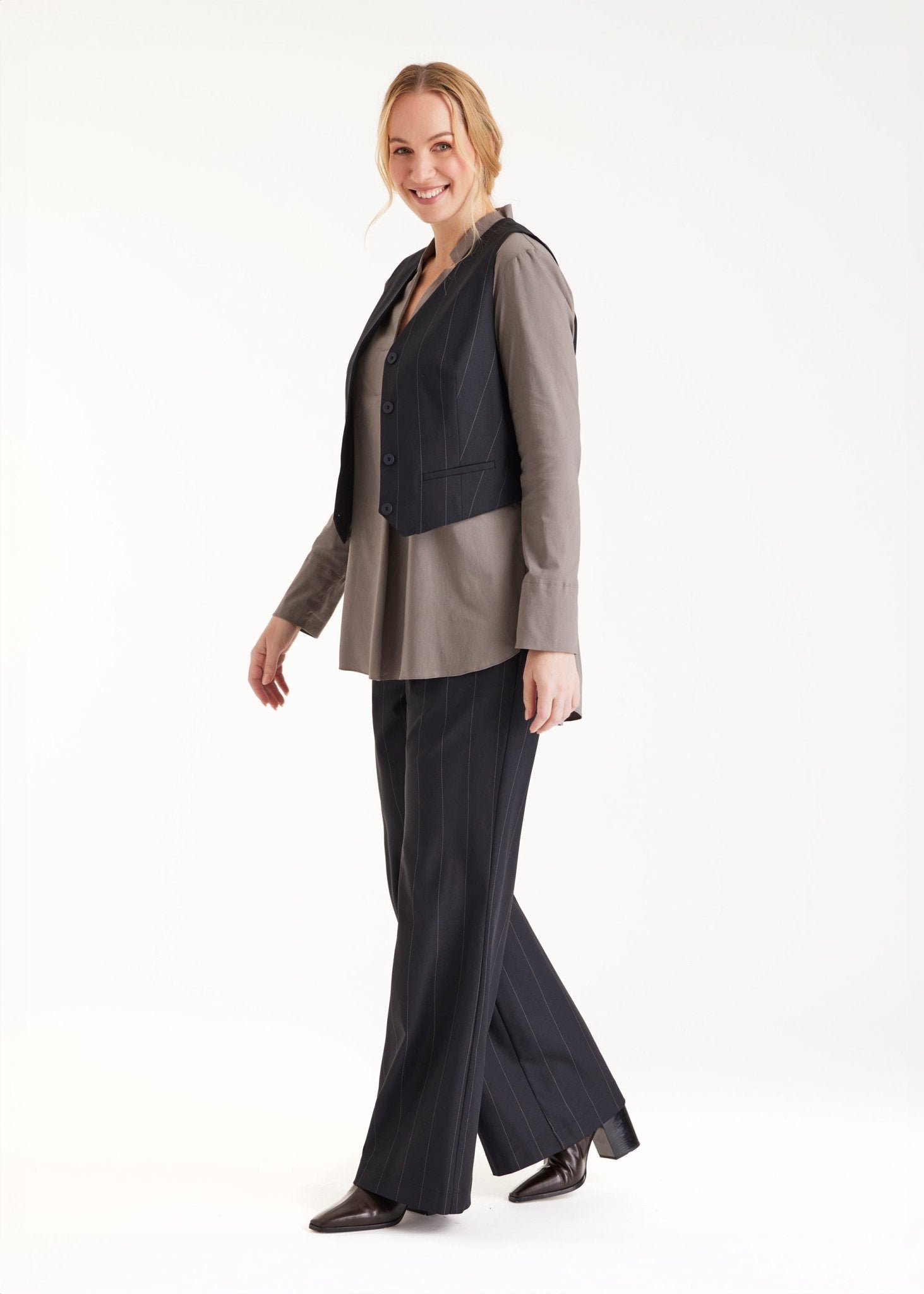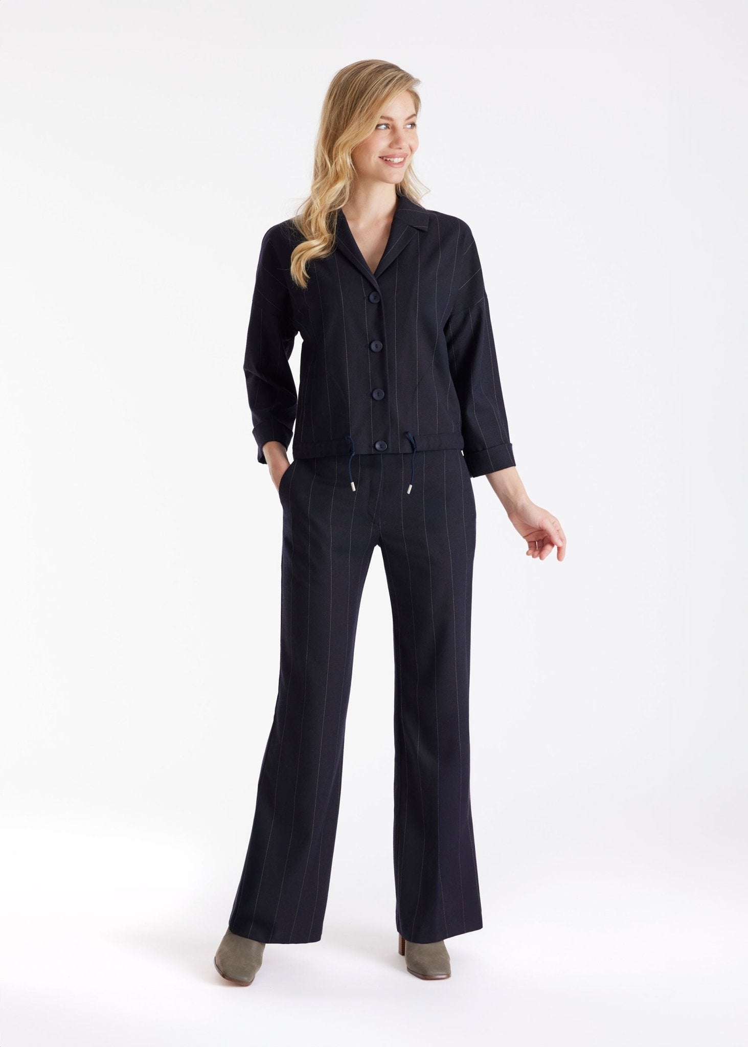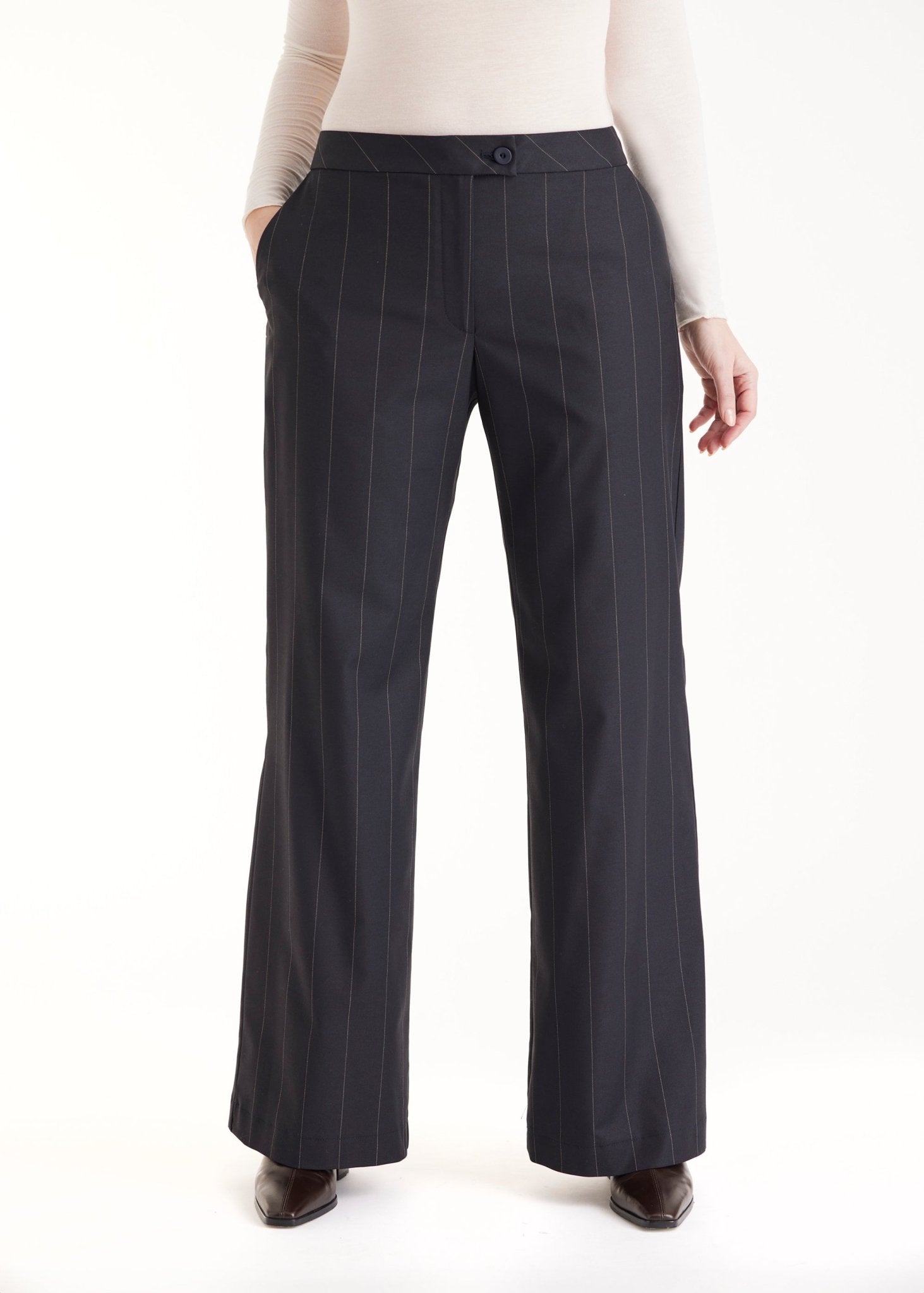 Klassisch und clean: Die lange Hose TADOKI mit geradem Bein und feinen Nadelstreifen ist ein echtes Kombi-Talent. Der Formbund mit Knopf und Reißverschluss sorgt für einen optimalen Sitz, während die gerade Passform bequem und stilvoll durch den Tag begleitet. Eingrifftaschen runden den Look funktional ab. Ideal für moderne Outfits mit lässiger Eleganz. Passt perfekt zu Weste TESCAWE.
