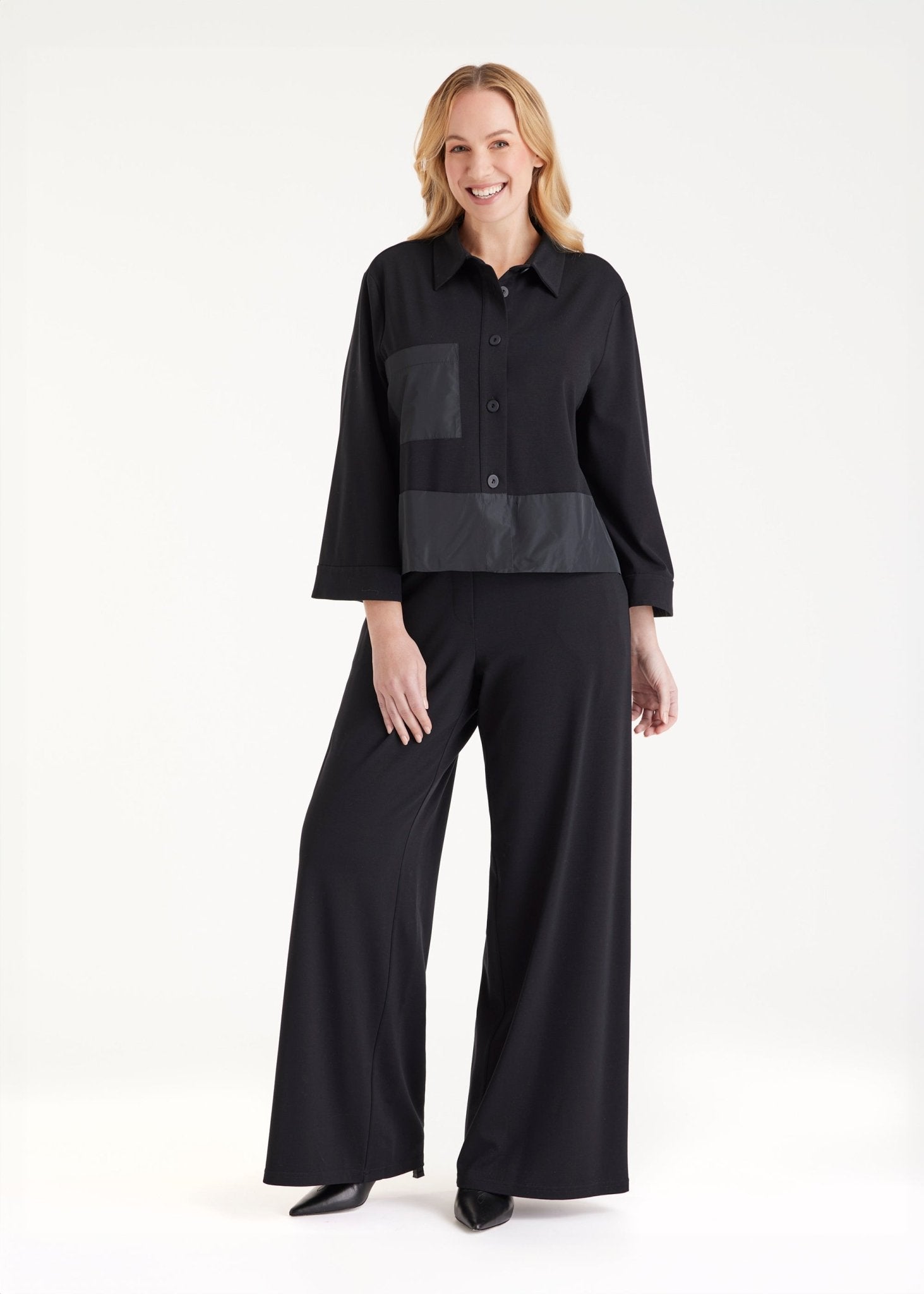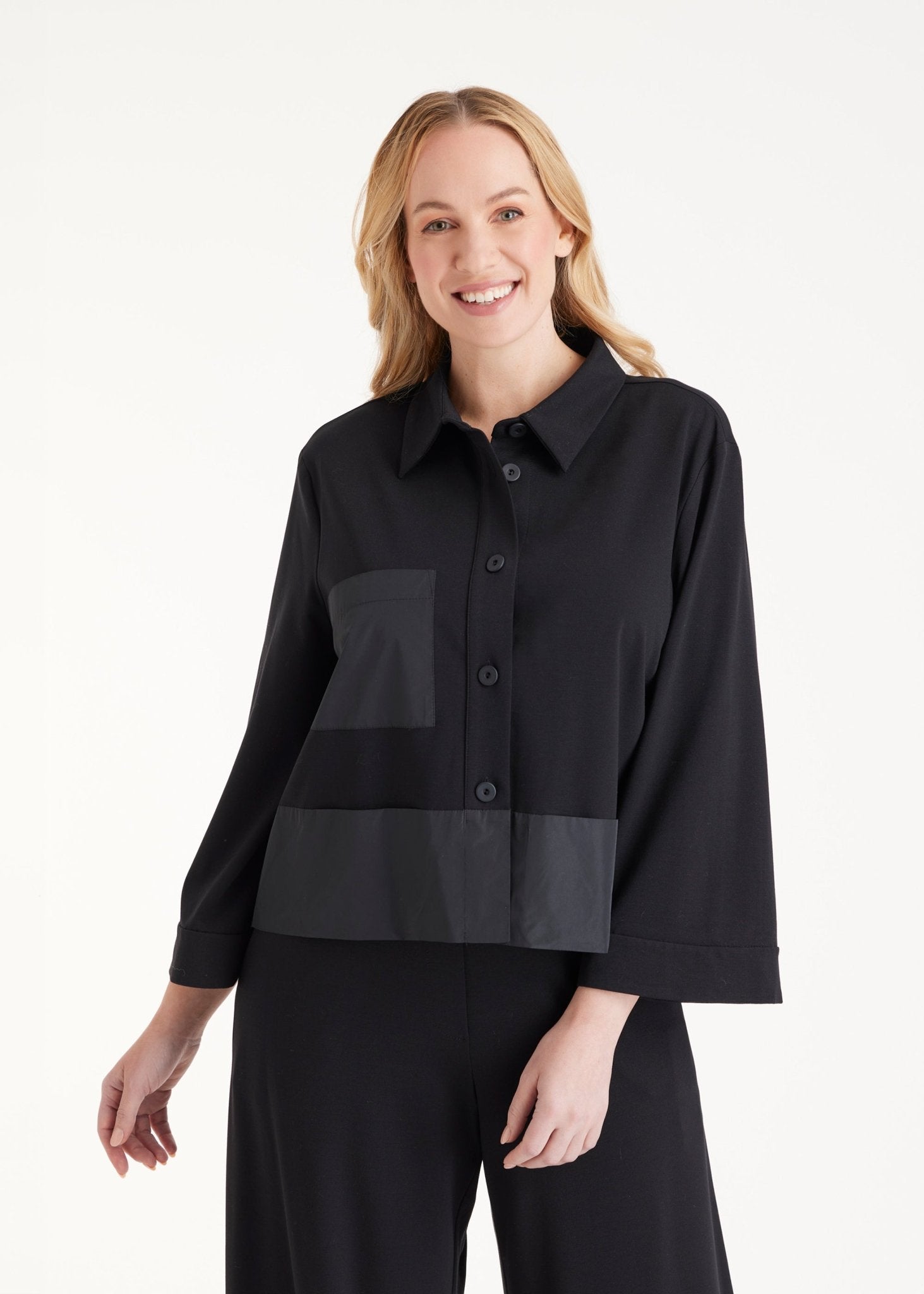 Ein Stück für alle, die klare Formen mögen, aber gerne aus der Reihe tanzen: Die kurze Blusenjacke GYAKI bringt mit ihrem klassischen Kragen und der klaren Knopfleiste Ordnung, die ausgestellte A-Linie dagegen Bewegung und Leichtigkeit ins Spiel. Der Clou: die aufgesetzte Tasche im Patch aus Taft. Das weiche Material aus Viskose-Stretch sorgt für Tragekomfort mit Struktur.