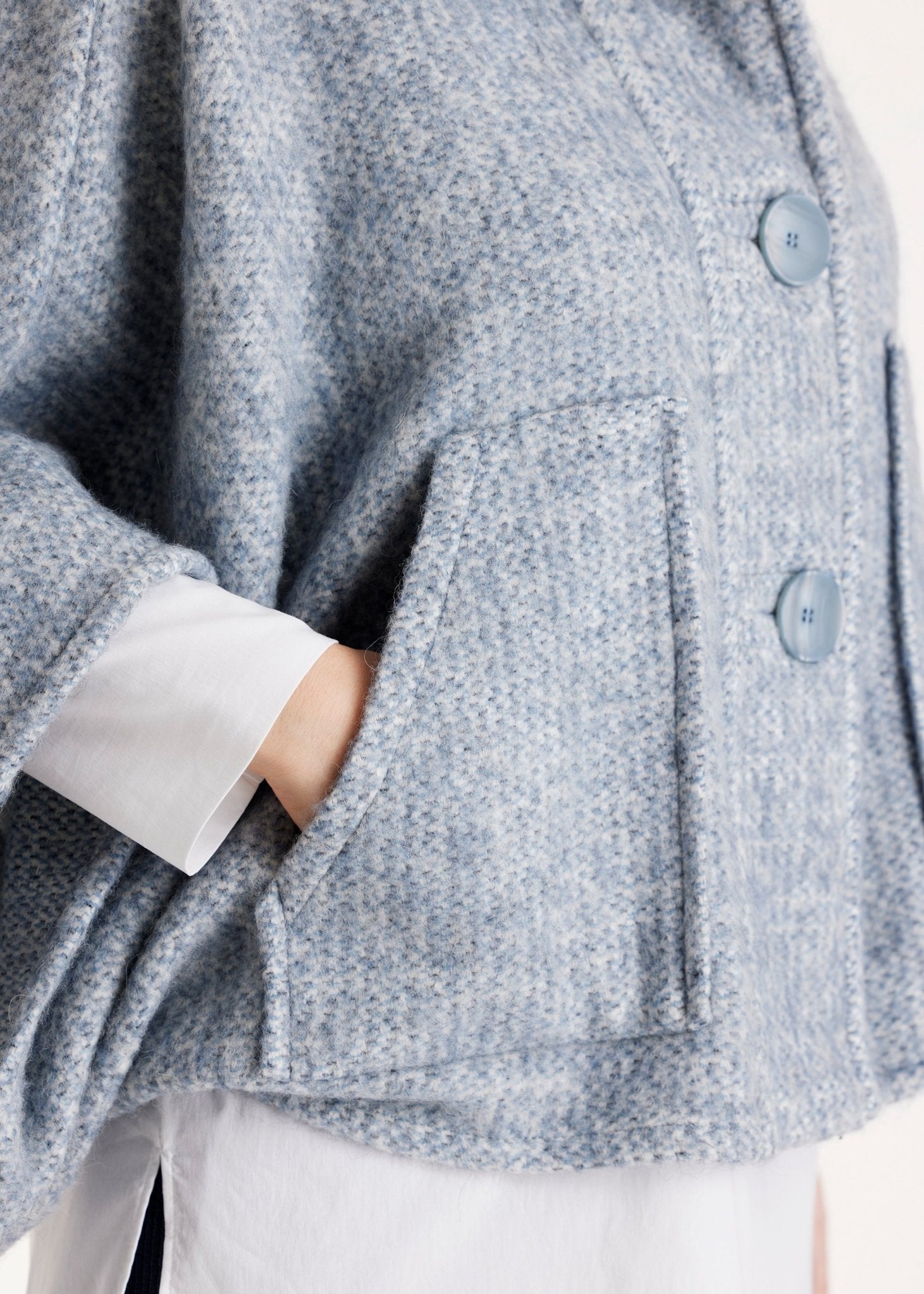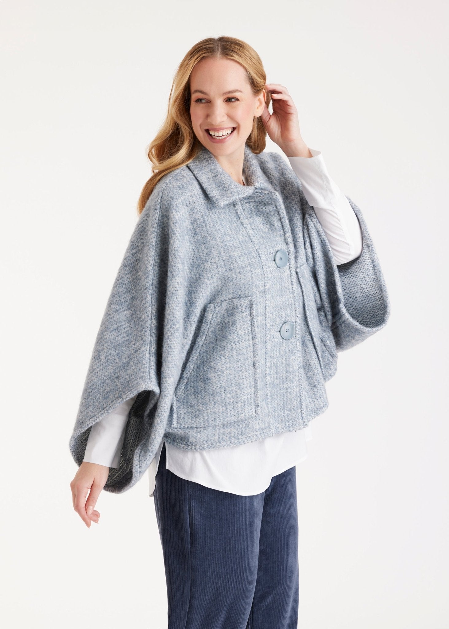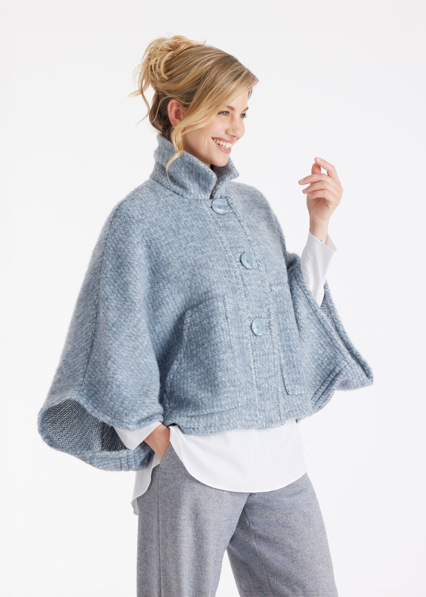 Ein echtes Statement-Piece für die Übergangszeit: Das kuschelige Cape YAMYKA mit weiten Armen und der legeren Passform wird zum idealen Begleiter für souveräne Layering-Looks. Die markante Knopfleiste vorn und die aufgesetzten Taschen verleihen dem Design einen besonderen Charakter.