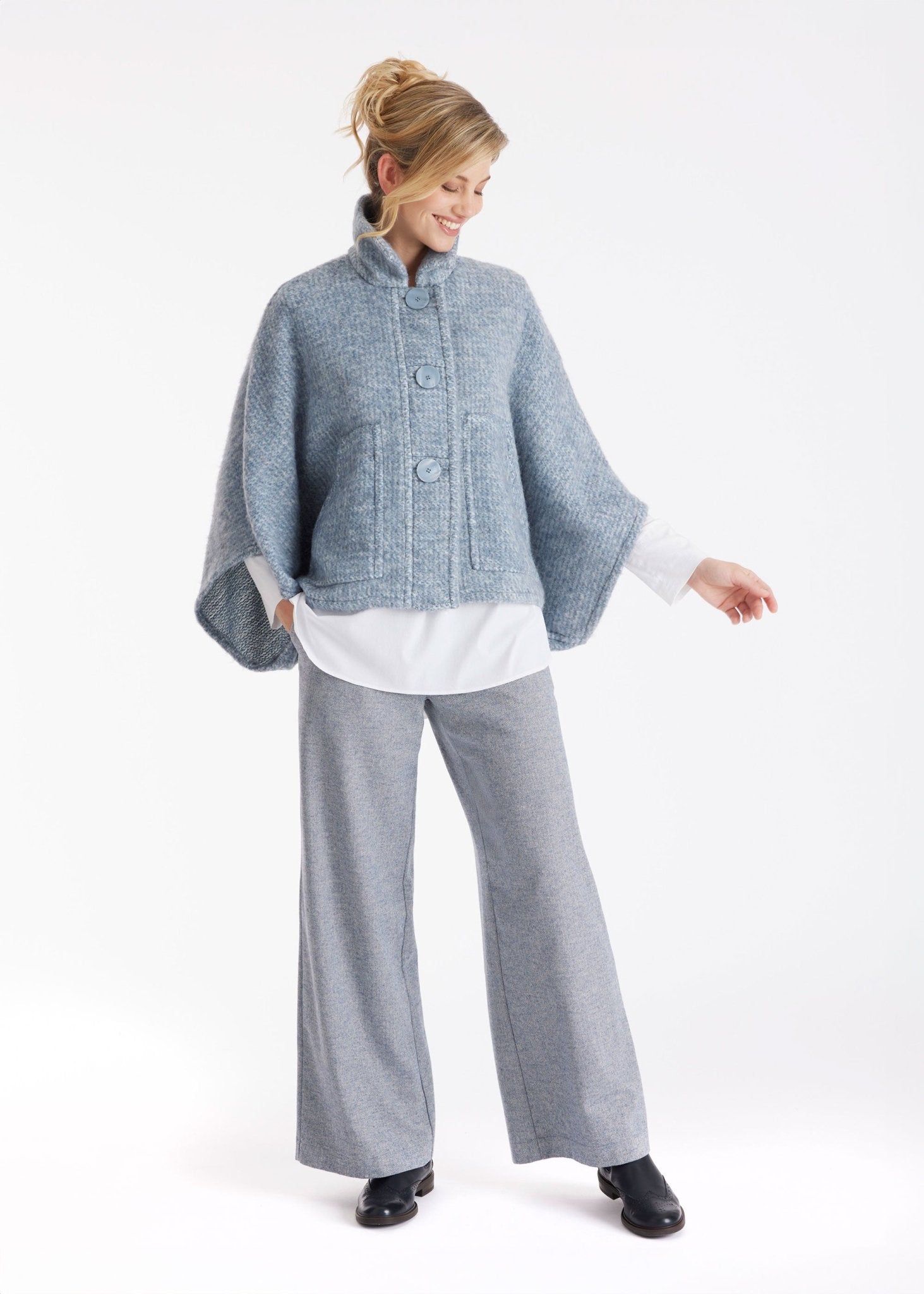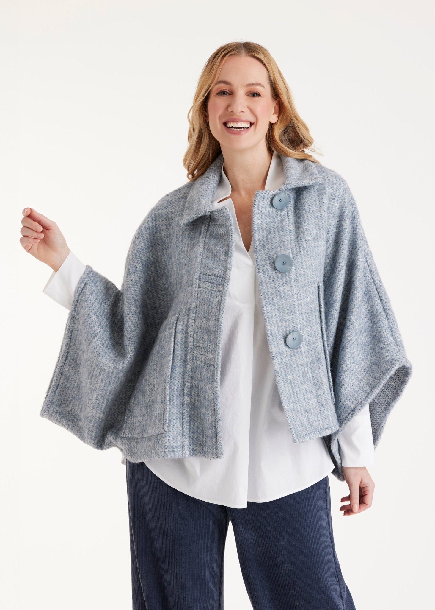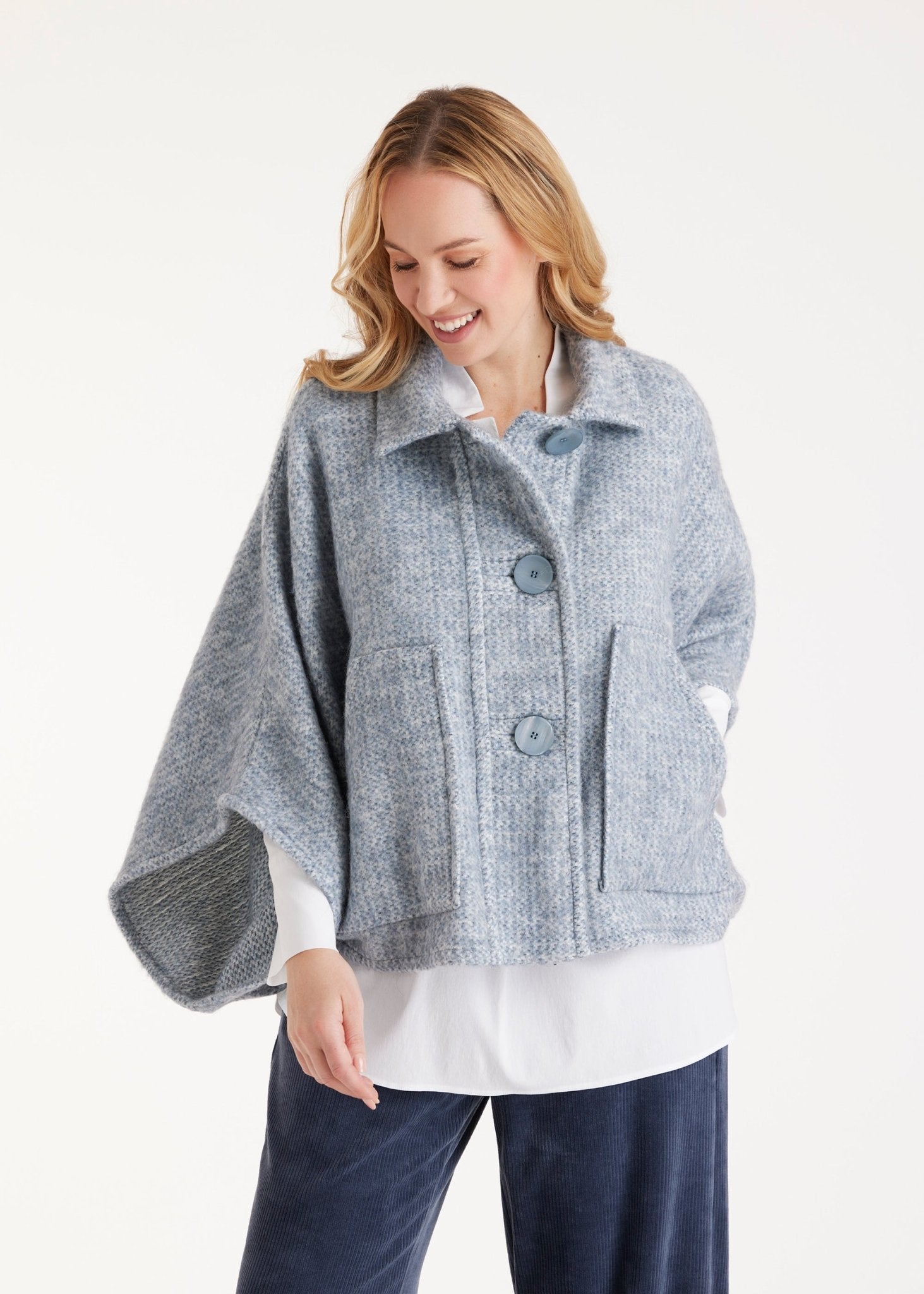 Ein echtes Statement-Piece für die Übergangszeit: Das kuschelige Cape YAMYKA mit weiten Armen und der legeren Passform wird zum idealen Begleiter für souveräne Layering-Looks. Die markante Knopfleiste vorn und die aufgesetzten Taschen verleihen dem Design einen besonderen Charakter.