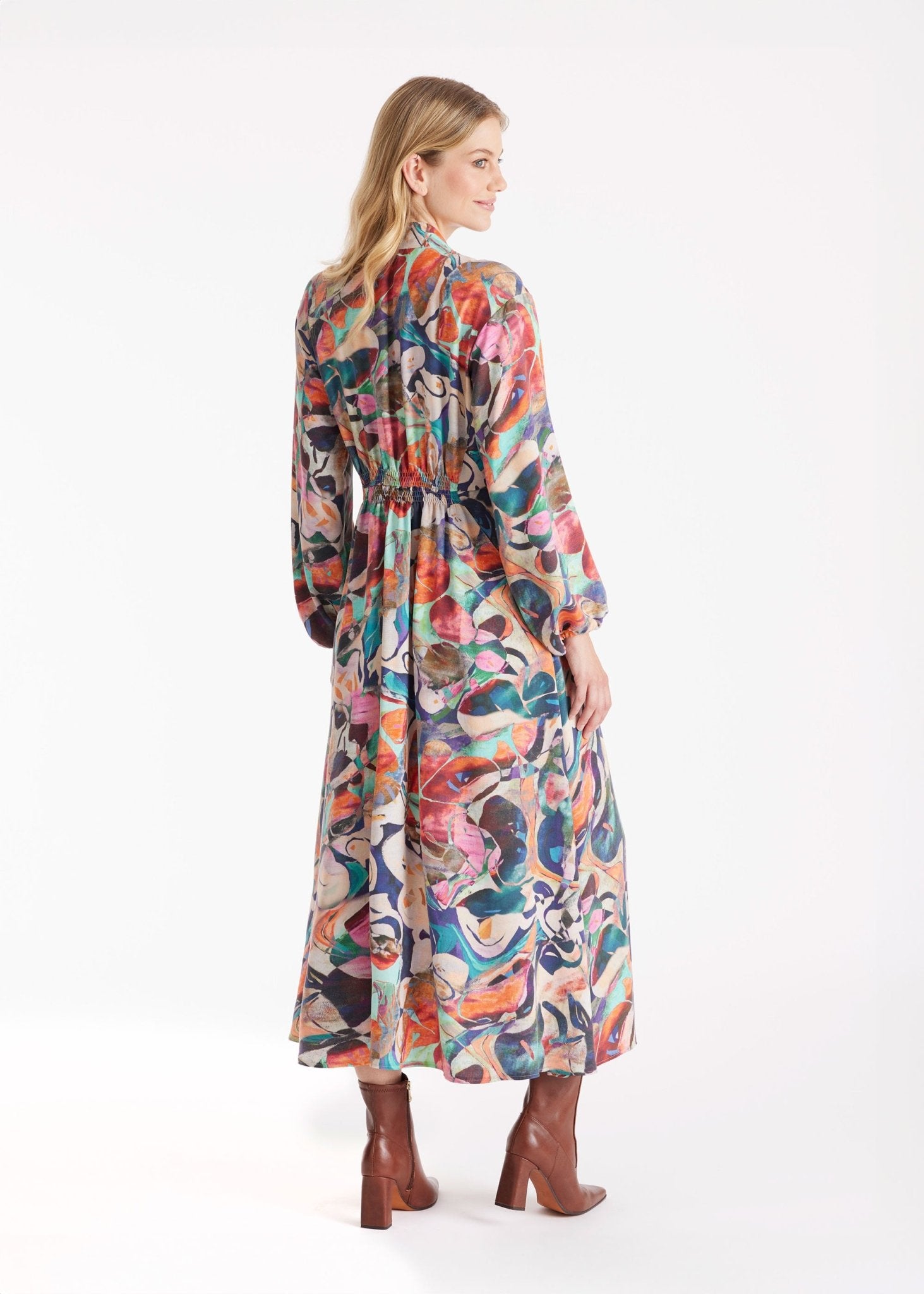 Das Kleid DYOTI strahlt Wärme aus – auch an kühlen Tagen. Der fließende Tencel-Stoff ist angenehm weich und bringt den floralen Print wunderbar zur Geltung. Der V-Ausschnitt und die sanfte Taillierung zaubern eine feminine Silhouette, während die praktischen Eingrifftaschen dem Look eine entspannte Note verleihen. In Kombination mit Stiefeletten und Strick wird dieses Kleid zum stilsicheren Begleiter durch Herbst und Winter.