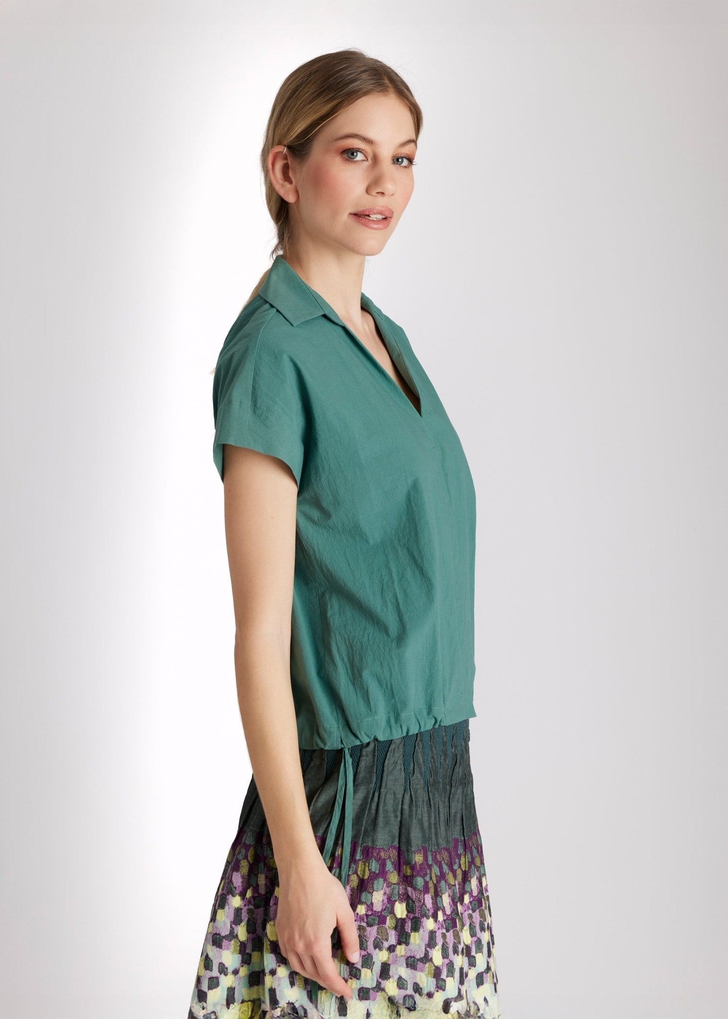 De BLUFFIE blouse belichaamt een moeiteloos stijlvolle zomerlook. De relaxte pasvorm, gemaakt van puur katoen, wordt geaccentueerd door korte mouwen en een V-hals met een overhemdkraag voor een frisse touch. De zoom met trekkoord zorgt voor een verstelbare pasvorm.