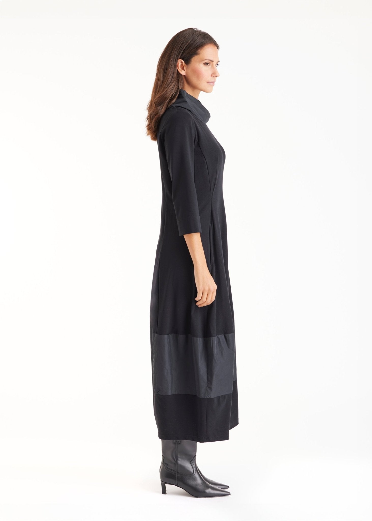 De GIROBO midi-jurk is een echte blikvanger, zonder opzichtig te zijn. De subtiele A-lijn speelt op een slimme manier met volume zonder de taille te accentueren. De mix van zachte viscose stretch en taft in het patchwork geeft het ontwerp extra karakter. De elegante opstaande kraag zorgt voor een casual maar toch opvallende look.