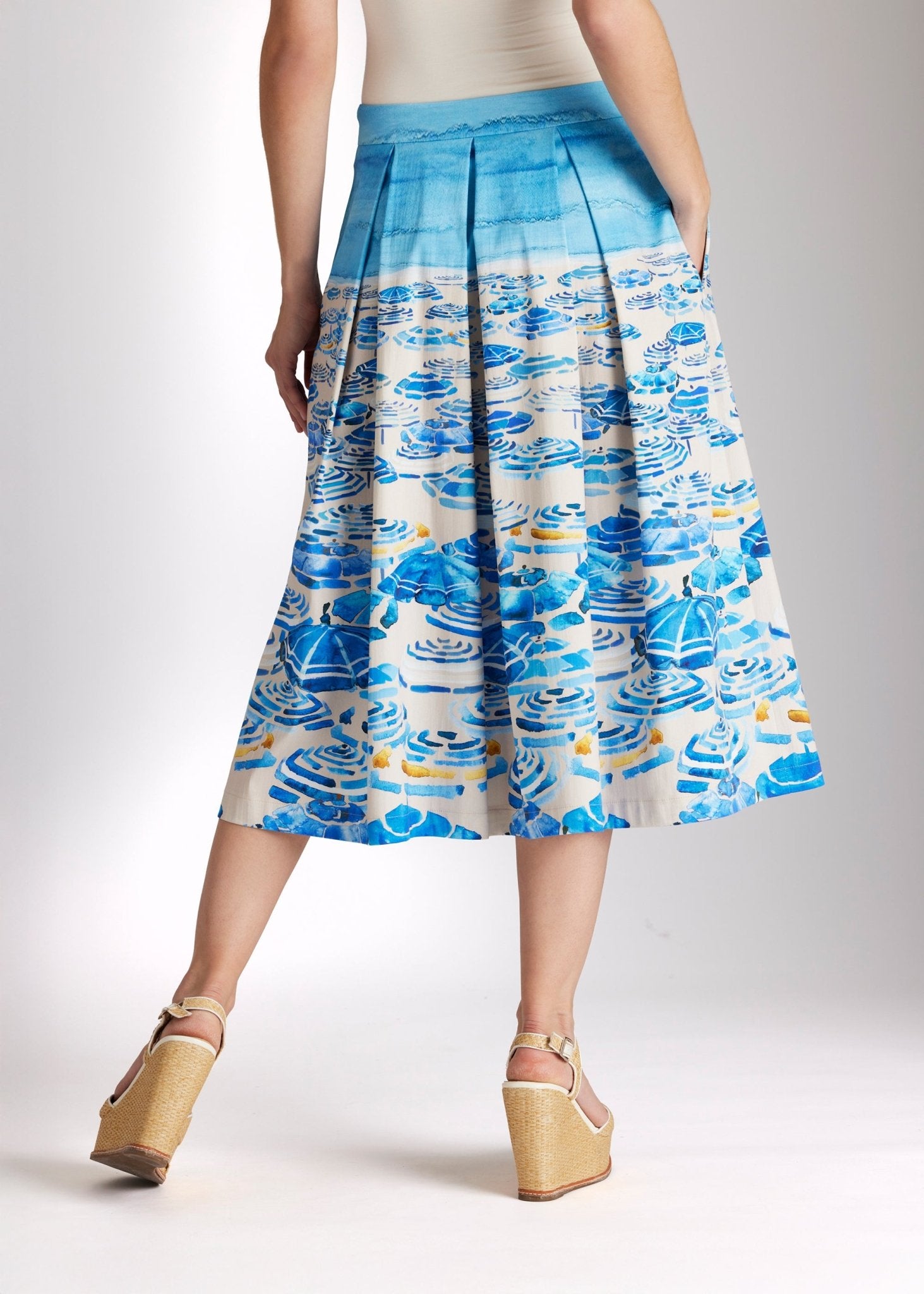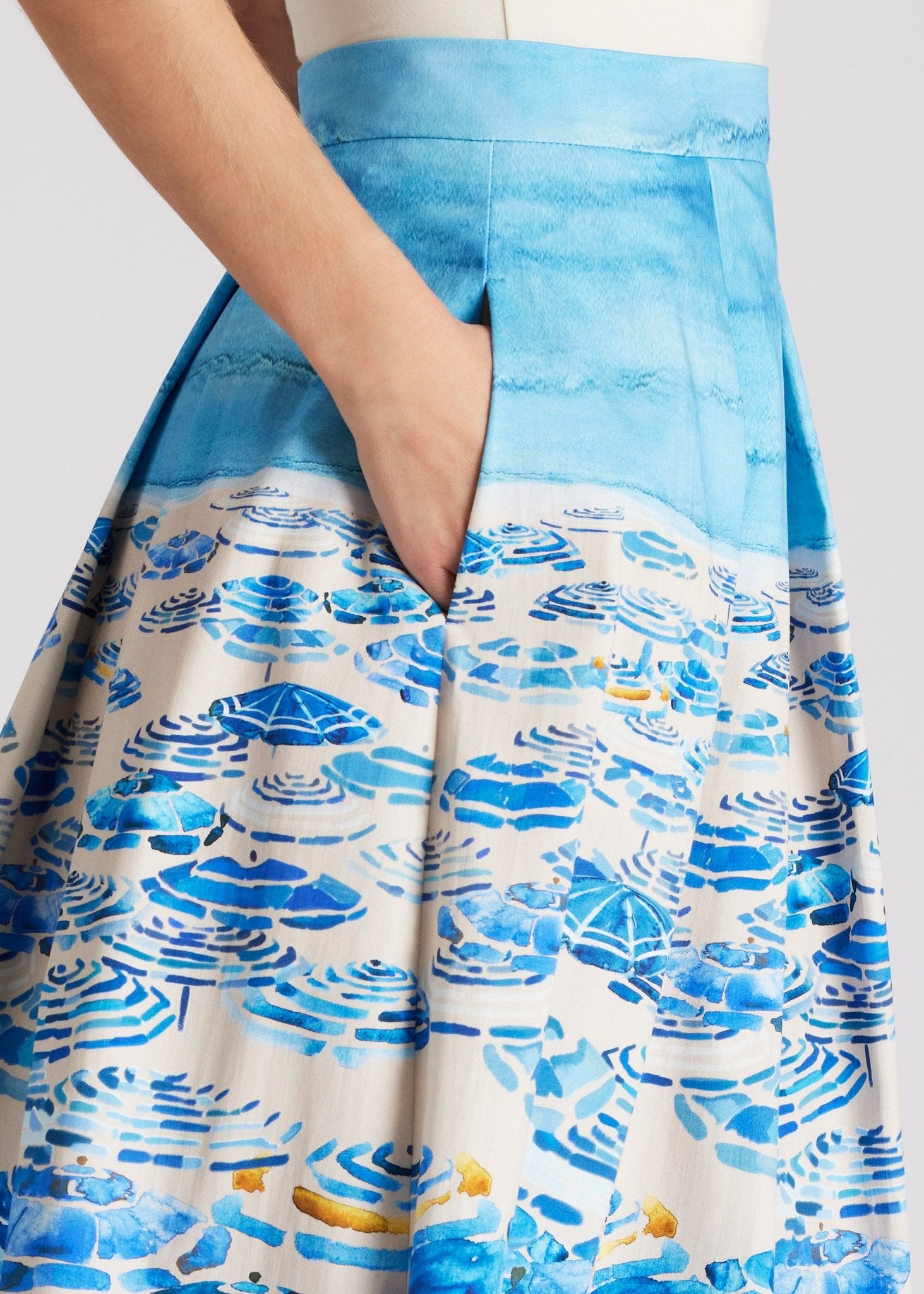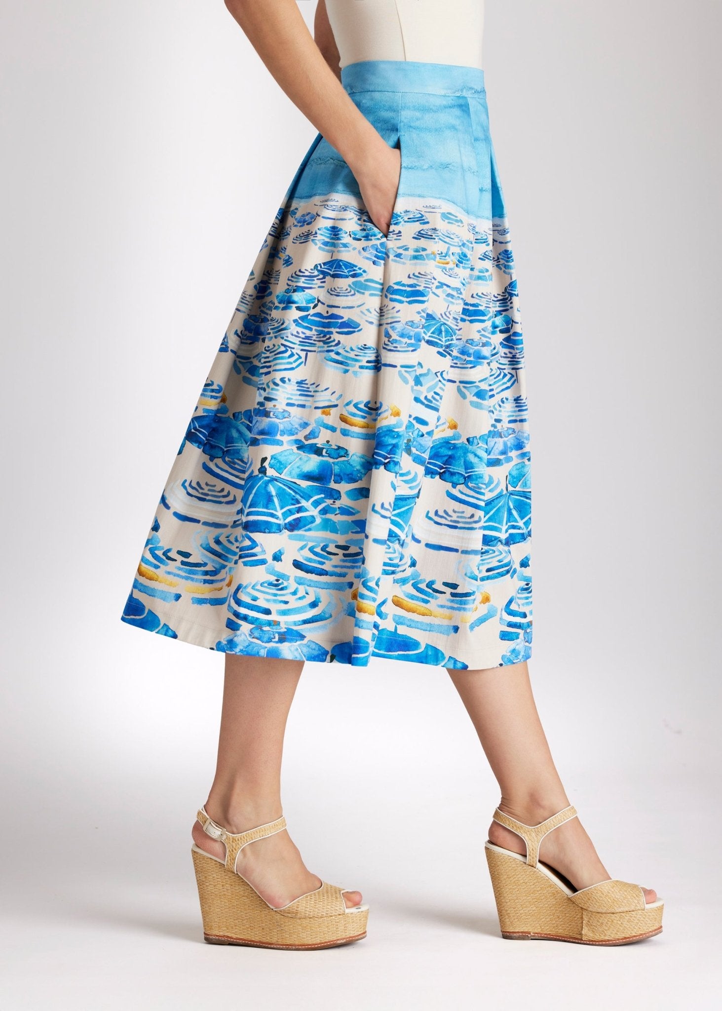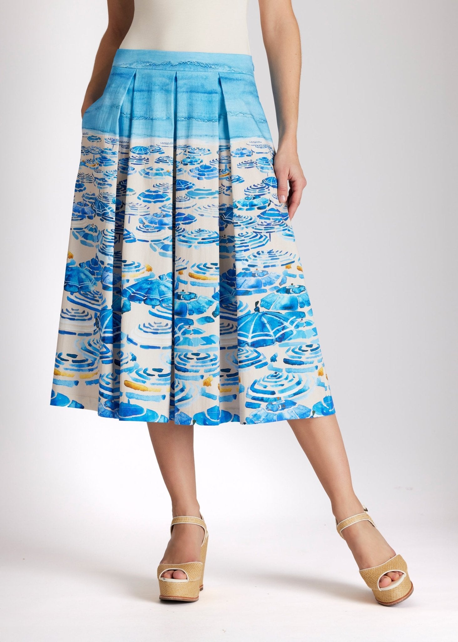 Zomerse vibes die je kunt dragen! De wijde FIPERO rok, gemaakt van soepel biologisch katoen, is een echte blikvanger voor zonnige dagen. De uitlopende snit en zwierige plooien zorgen voor een prachtig silhouet. De unieke parasolprint draagt bij aan het vrolijke, vakantiegevoel.