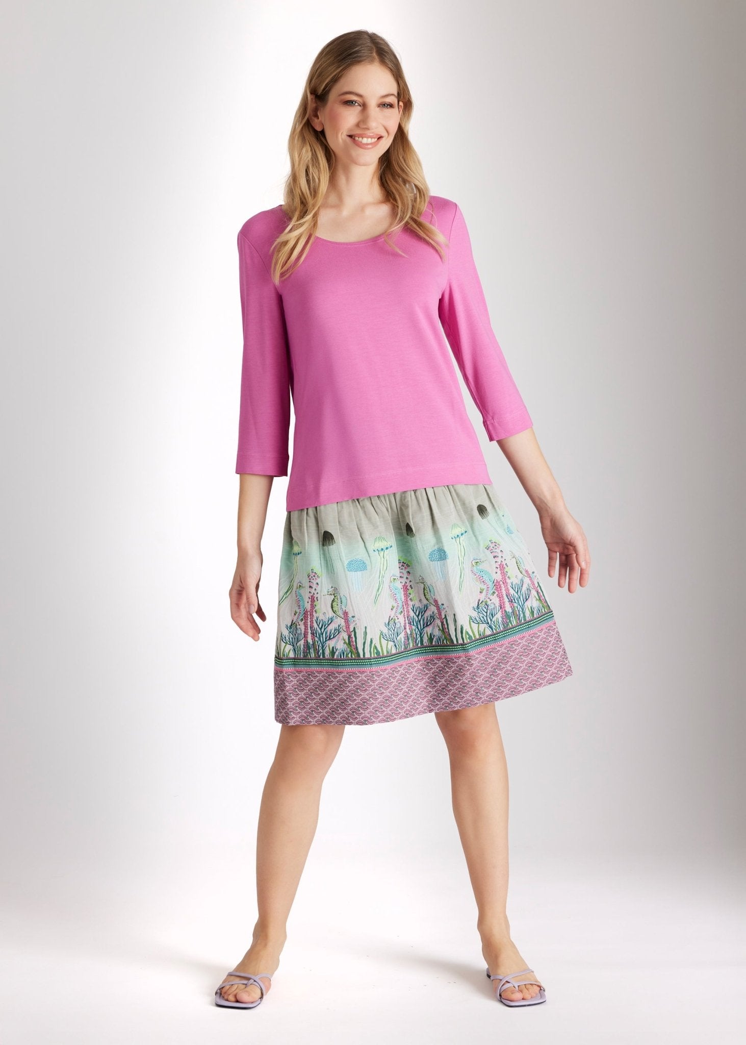 De ideale basic: ons CEMONTA-shirt, gemaakt van zachte viscosejersey, overtuigt met zijn ongecompliceerde comfort en tijdloze elegantie. De rechte snit, klassieke ronde hals en driekwartmouwen zorgen voor een strakke look. Draag het met onze LACROS-S rok (one size) voor een relaxte maar stijlvolle alledaagse outfit.