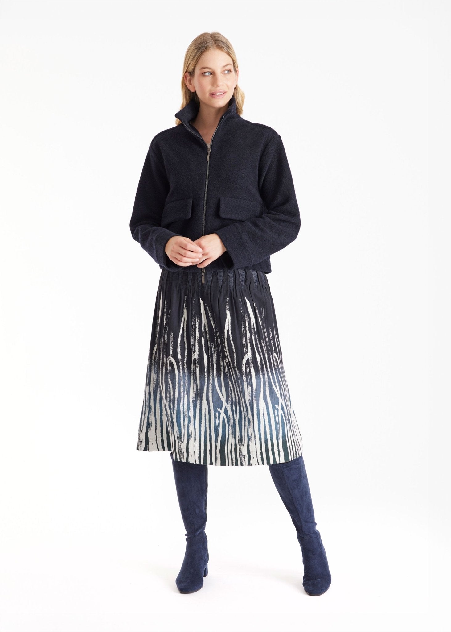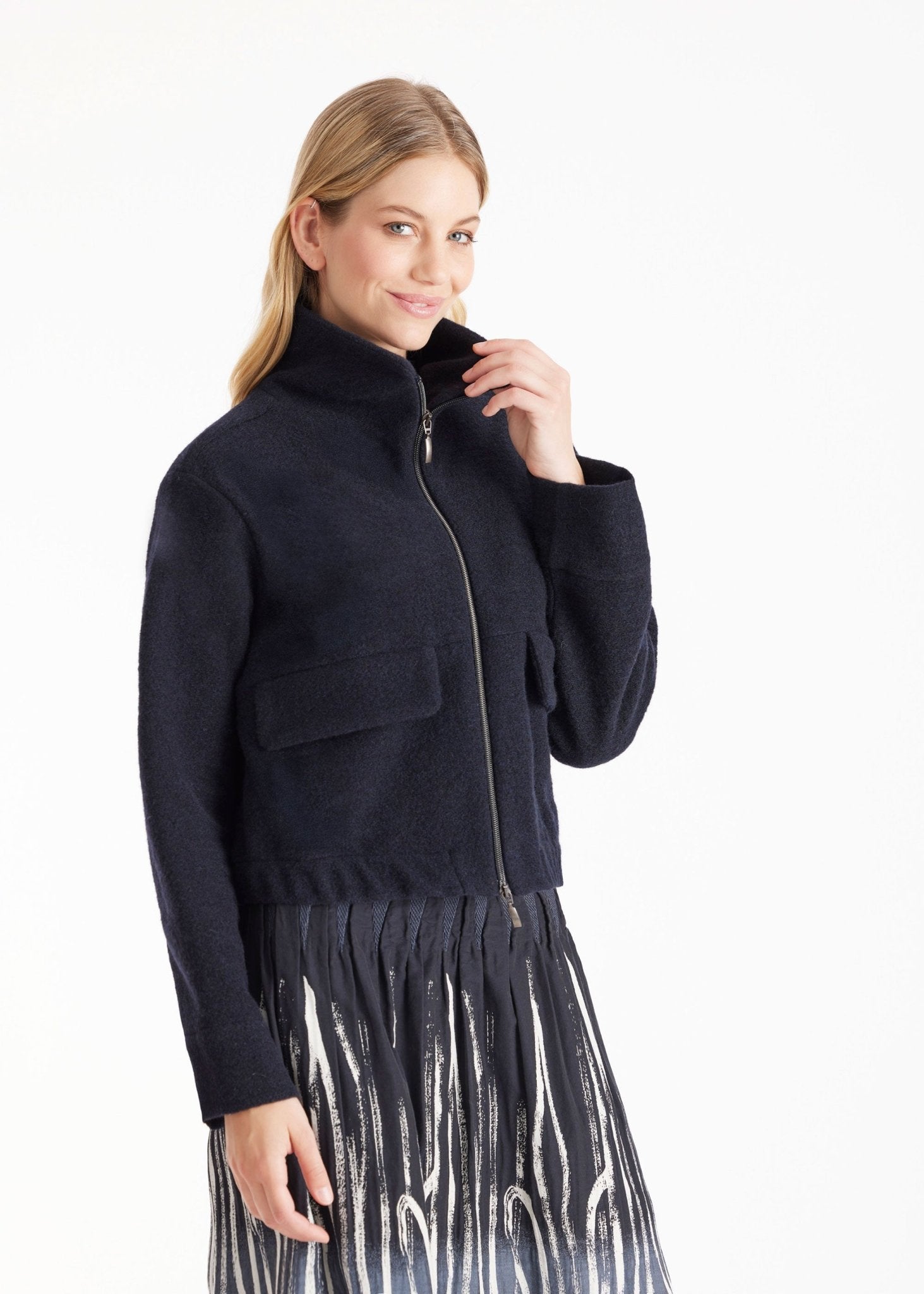 Ideal für kühle Tage: Die Jacke MARIERA aus Schurwolle kombiniert Wärme mit Style. Der hohe Kragen schützt zuverlässig vor kalter Herbstluft, der durchgehende Reißverschluss sorgt für zusätzlichen Komfort und Flexibilität. Mit ihrem kurzen, geraden Schnitt und den aufgesetzten Taschen vorn bietet die Jacke einen modernen Look. Der elastische Bund garantiert eine bequeme Passform.