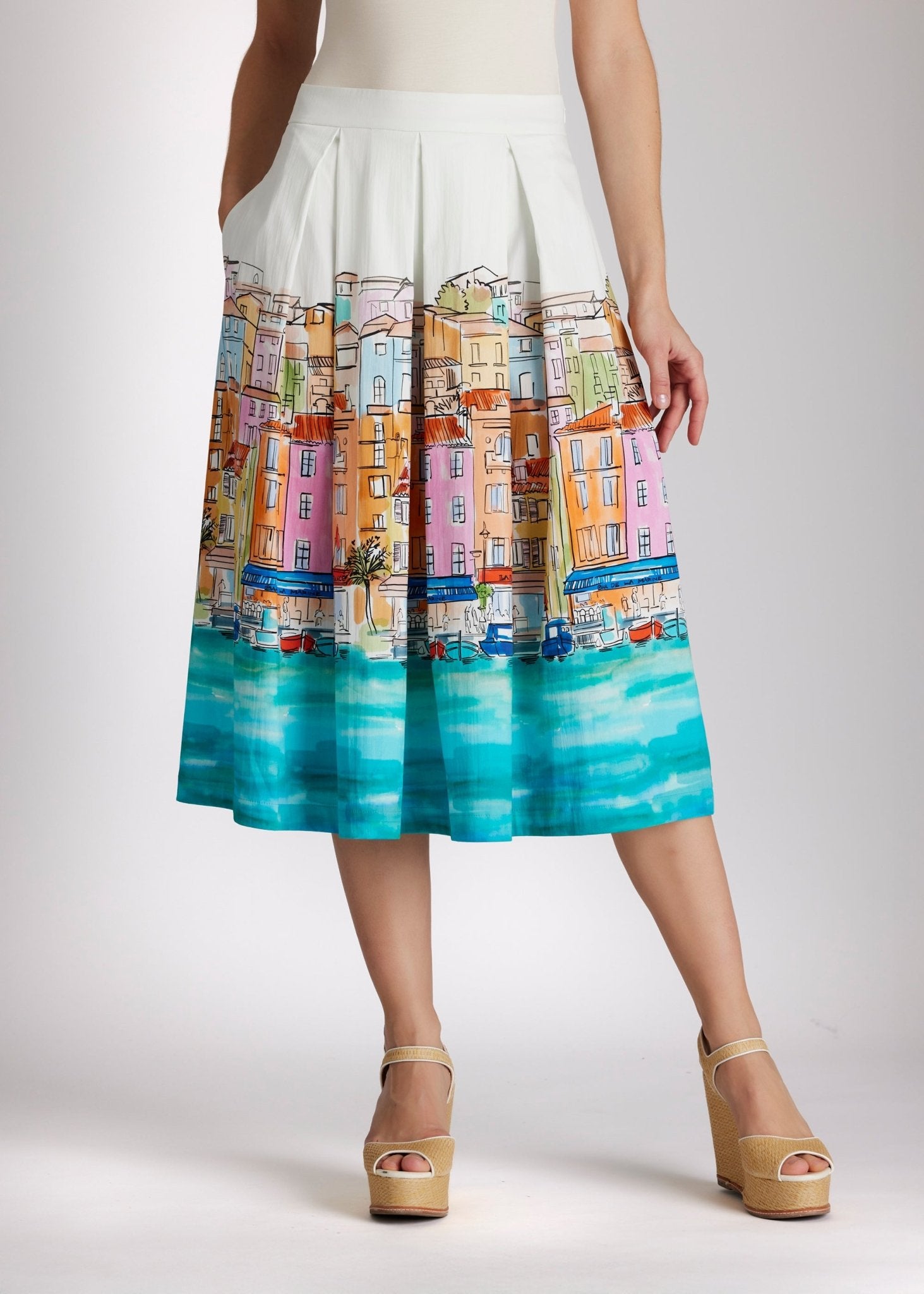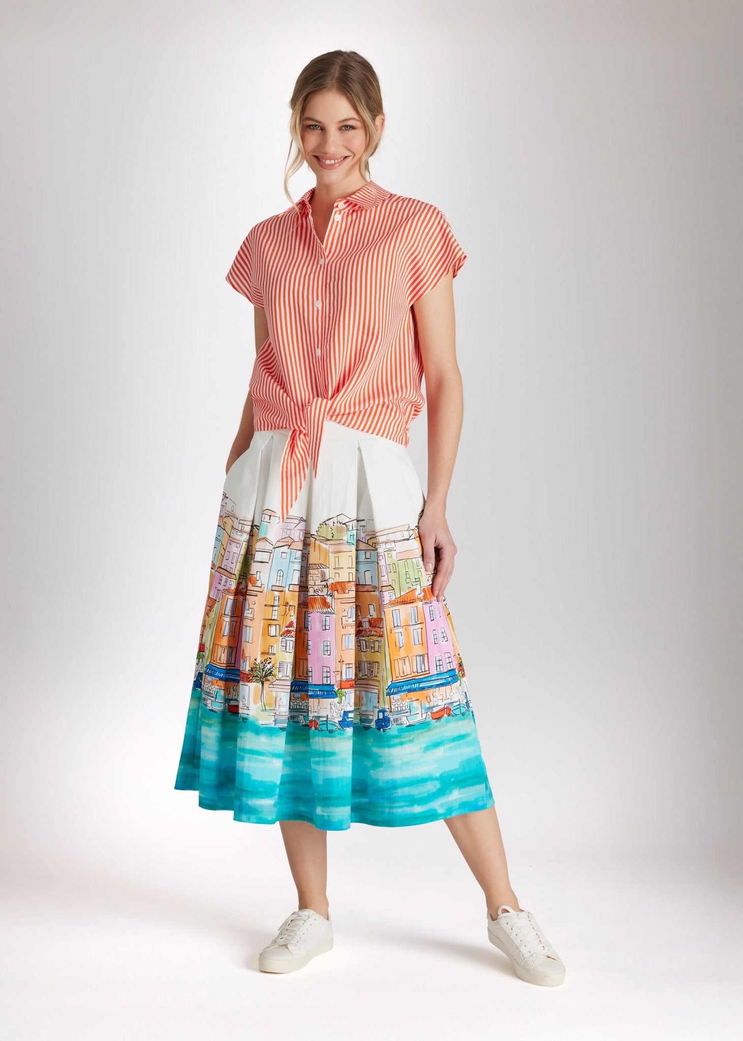 Zomerse vibes die je kunt dragen! De wijde FIPERO rok, gemaakt van soepel biologisch katoen, is een echte blikvanger voor zonnige dagen. De uitlopende snit en zwierige plooien zorgen voor een prachtig silhouet. De unieke print van het huis voegt een vleugje vrolijkheid en een vakantiegevoel toe.