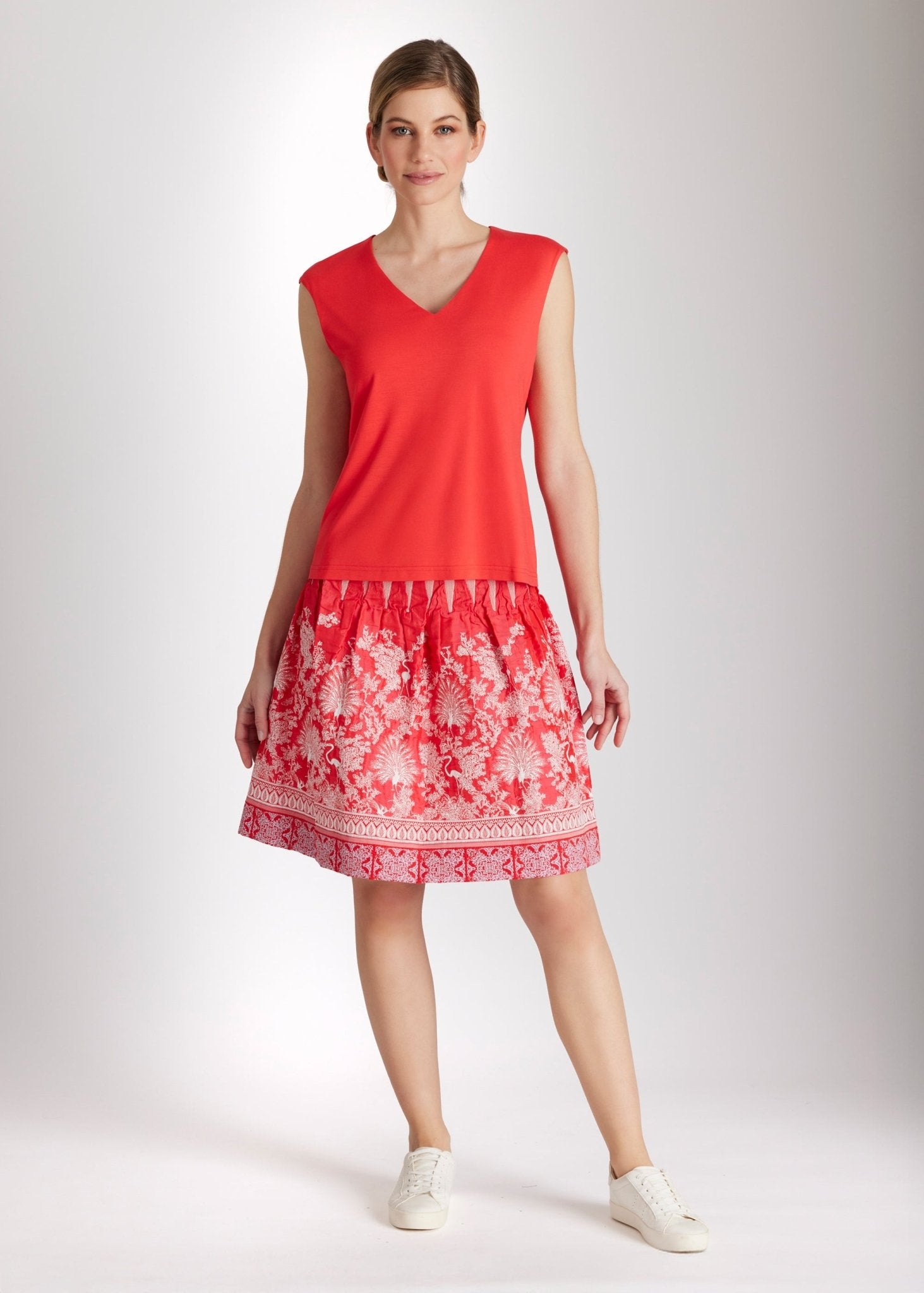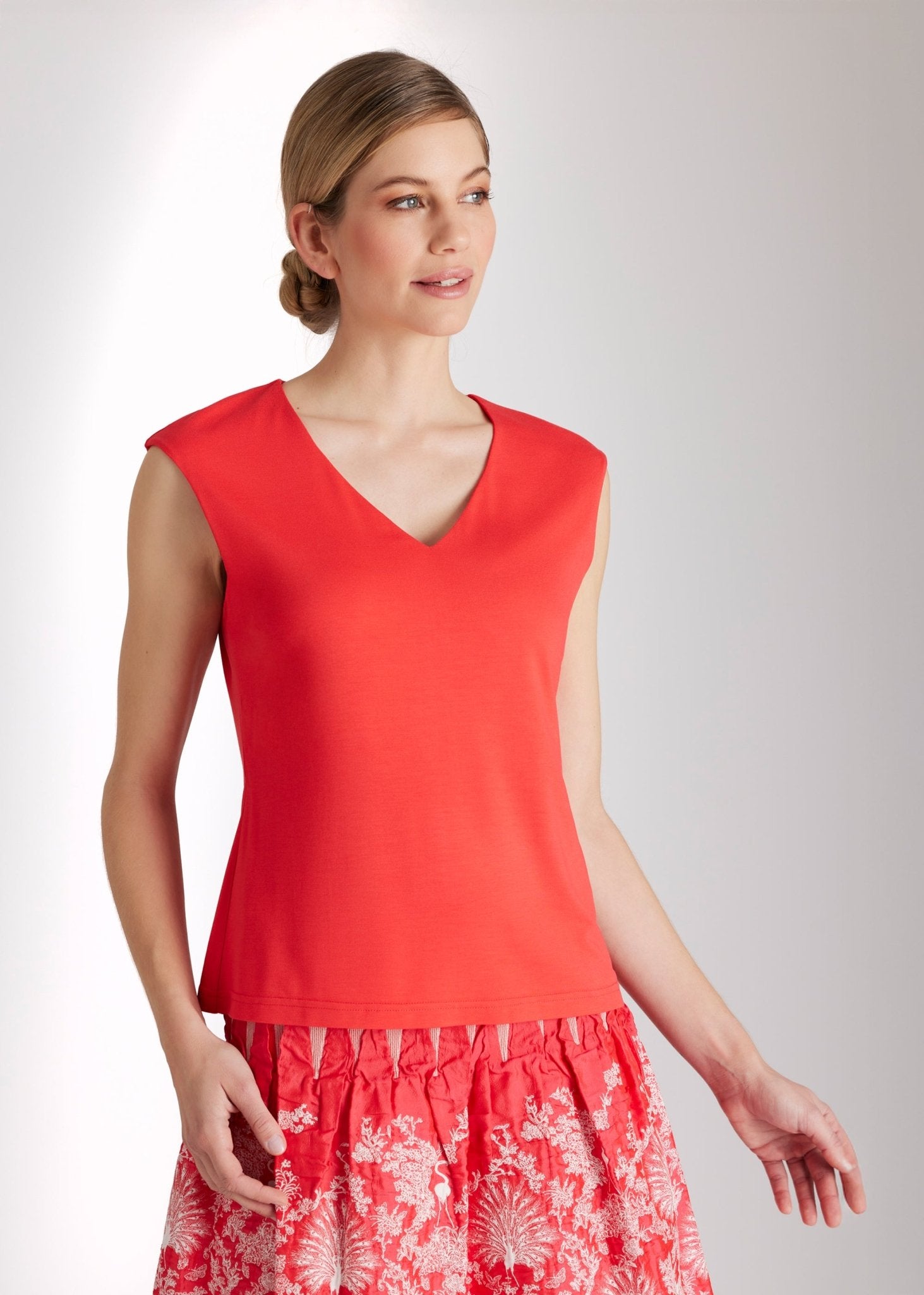 Ein echter Allrounder für warme Tage: das ärmellose Shirt CIVANUA aus softem Viskosejersey. Der schmale Schnitt betont die Silhouette, während der V-Ausschnitt dem Look eine frische Note verleiht. Leicht, unkompliziert und perfekt, um es solo oder unter Blazer und Jacke zu tragen.